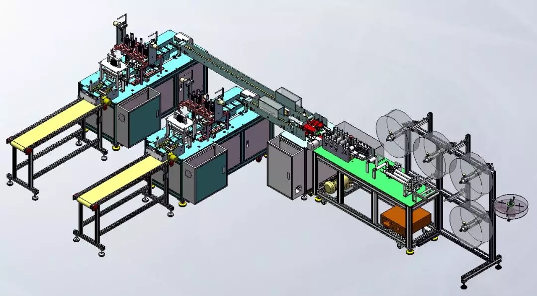 本機(jī)主要用于平面式口罩自動(dòng)成型:整卷布料放卷后經(jīng)過(guò)滾輪驅(qū)動(dòng),布料通過(guò)自動(dòng)折邊、包邊;鼻梁條整卷牽引開卷,定長(zhǎng)裁切后導(dǎo)入至包邊布料中,雙邊通過(guò)超聲焊接至封口,再經(jīng)過(guò)超聲側(cè)向封口,通過(guò)切刀裁切成型、流水線將口罩輸送至兩個(gè)口罩耳帶熔接工位、超聲焊接最終口罩成型;當(dāng)口罩制成后,通過(guò)流水線輸送至平帶線收集。