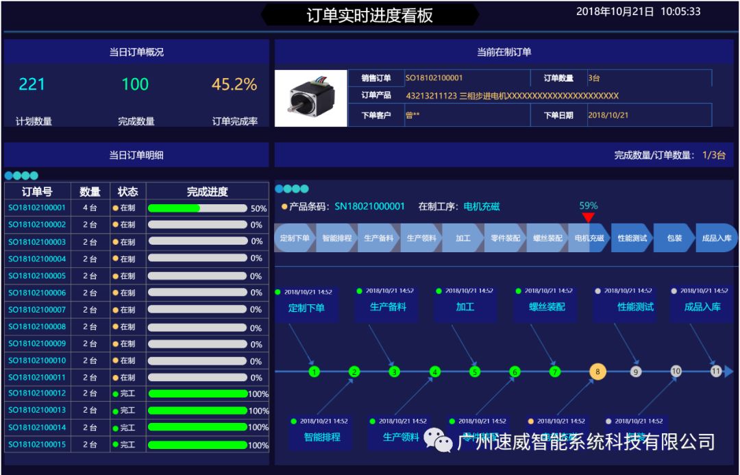 工廠可通過MES目視化監(jiān)控功能實現(xiàn)海量訂單數(shù)據(jù)的統(tǒng)計分析,訂單生產(chǎn)進度的實時查詢。針對每個客戶訂單,根據(jù)工藝路線,實時將每個工序的完成狀況顯示出來;同時自動跟蹤每個生產(chǎn)工令的開工、生產(chǎn)異常停機、不良種類和數(shù)量、停機情況等。方便生產(chǎn)透明化管理,追溯到每個人員、設(shè)備和物料,并能對逾期訂單提前預(yù)警,實時掌控客戶訂單按時交期和生產(chǎn)狀況。