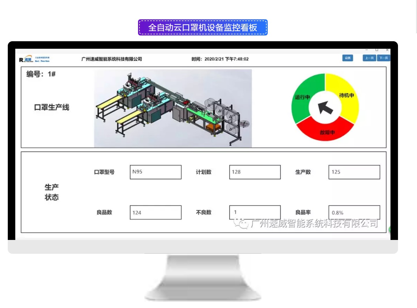 速威智能全自動(dòng)云口罩機(jī)交貨期比同行少20-25天,日產(chǎn)能達(dá)到12萬(wàn)只!在確保口罩機(jī)交期的情況下保證了設(shè)備的質(zhì)量。同時(shí),速威智能采用速威云監(jiān)控系統(tǒng)對(duì)設(shè)備進(jìn)行實(shí)時(shí)監(jiān)控口罩的生產(chǎn)進(jìn)度和計(jì)劃達(dá)成率、良品率、設(shè)備的狀態(tài)并實(shí)時(shí)反饋給管理人員,大大減少生產(chǎn)過(guò)程中因?yàn)樵O(shè)備異常從而影響產(chǎn)能。