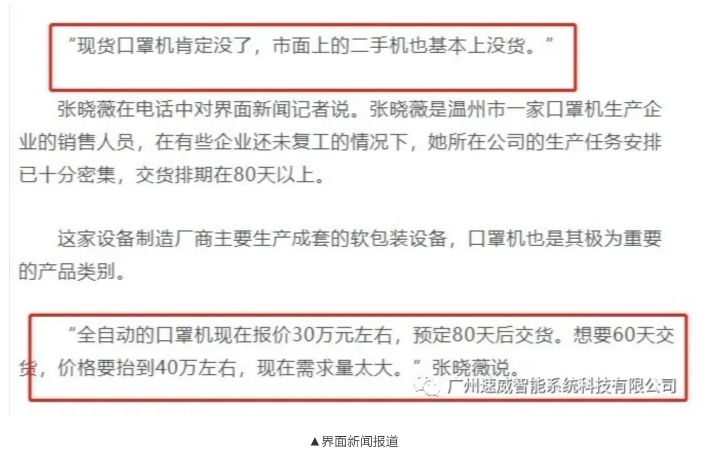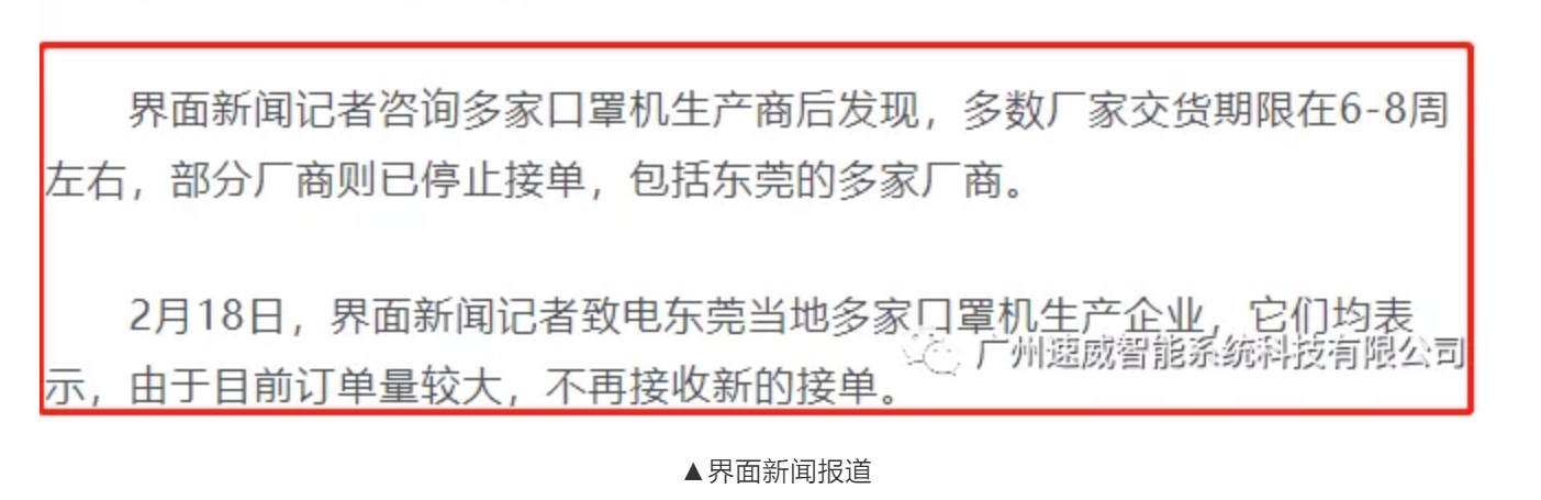 在疫情發(fā)生之后,口罩需求量激增,對(duì)應(yīng)的口罩生產(chǎn)設(shè)備需求量也呈幾何倍數(shù)增長(zhǎng),原來(lái)專(zhuān)業(yè)生產(chǎn)口罩機(jī)的訂單已經(jīng)爆滿(mǎn),停止接單,產(chǎn)能不足,交期很難保證。