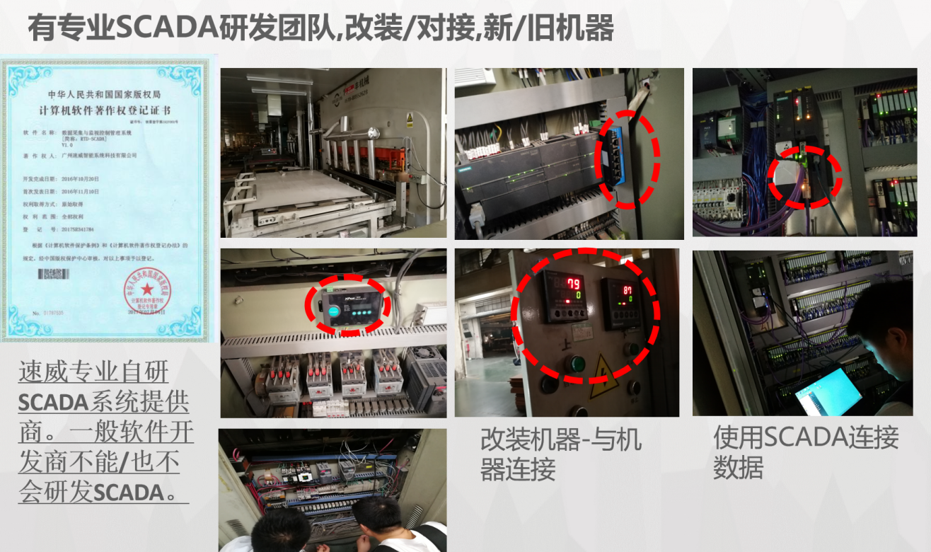 在2016年,我們就成立了SCADA專業(yè)團隊,由電子通信專業(yè)、熟悉機械操作的成員組成,與傳統(tǒng)MES供應商的IT、電腦開發(fā)人員不同:該團隊的技術專業(yè),側重于現(xiàn)有機器對接、舊有機器改裝。 下圖是我們的SCADA專利認證、其他是我司在成功案例中,對機器進行對接與改裝的現(xiàn)場照片。