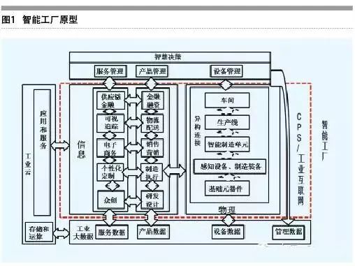 企業(yè)基于CPS和工業(yè)互聯(lián)網(wǎng)構(gòu)建的智能工廠原型,主要包括物理層、信息層、大數(shù)據(jù)層、工業(yè)云層、決策層。其中,物理層包含工廠內(nèi)不同層級(jí)的硬件設(shè)備,從最小的嵌入設(shè)備和基礎(chǔ)元器件開始,到感知設(shè)備、制造設(shè)備、制造單元和生產(chǎn)線,相互間均實(shí)現(xiàn)互聯(lián)互通。以此為基礎(chǔ),構(gòu)建了一個(gè)“可測可控、可產(chǎn)可管”的縱向集成環(huán)境。信息層涵蓋企業(yè)經(jīng)營業(yè)務(wù)各個(gè)環(huán)節(jié),包含研發(fā)設(shè)計(jì)、生產(chǎn)制造、營銷服務(wù)、物流配送等各類經(jīng)營管理活動(dòng),以及由此產(chǎn)生的眾創(chuàng)、個(gè)性化定制、電子商務(wù)、可視追蹤等相關(guān)業(yè)務(wù)。在此基礎(chǔ)上,形成了企業(yè)內(nèi)部價(jià)值鏈的橫向集成環(huán)境,實(shí)現(xiàn)數(shù)據(jù)和信息的流通和交換。