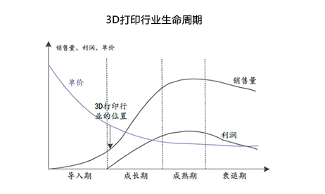 3D打印經(jīng)過了近 40 年的發(fā)展,龍頭公司開始實(shí)現(xiàn)顯著盈利,市場認(rèn)可度快速上升,行業(yè)收入增長加速。根據(jù)典型的產(chǎn)品生命周期理論,技術(shù)產(chǎn)品從導(dǎo)入期進(jìn)入成長期的過程中往往表現(xiàn)出加速增長的特征,判斷目前3D打印產(chǎn)業(yè)正在進(jìn)入加速成長期。