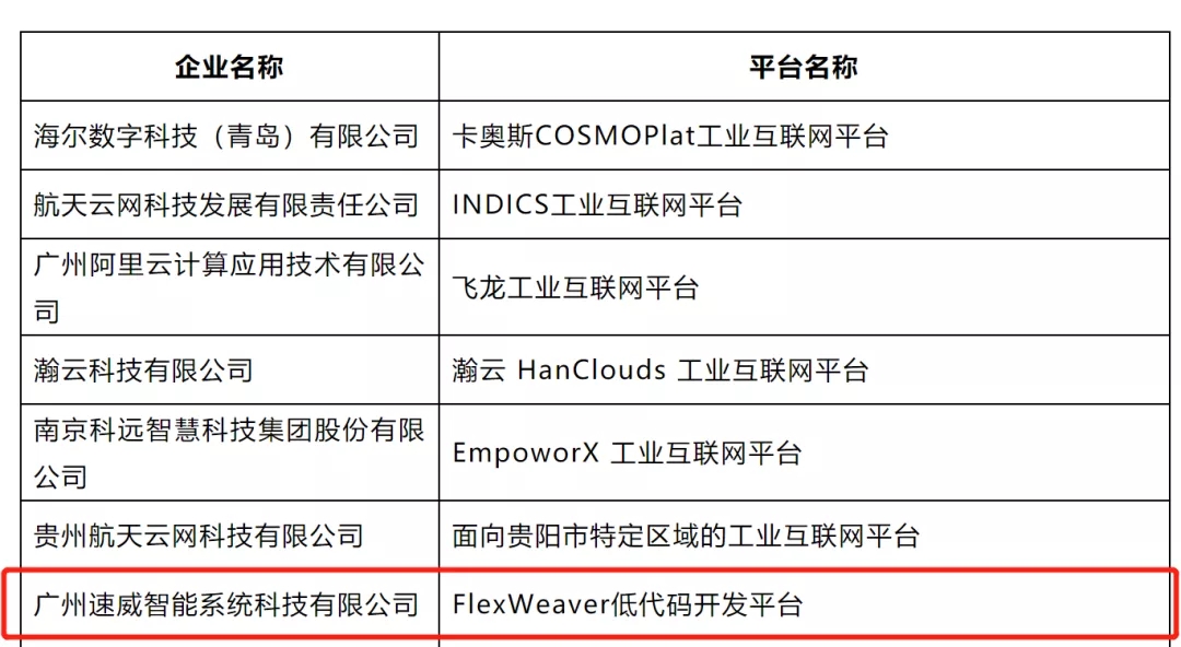 2019年底中國信通院聯(lián)合聯(lián)盟成員單位,編制發(fā)布了《工業(yè)互聯(lián)網(wǎng)平臺測試驗證》聯(lián)盟標準(AII/001-2019)。標準驗證過程中,廣州速威智能系統(tǒng)科技有限公司-FlexWeaver低代碼開發(fā)平臺,憑借其高開發(fā)效率和幫助企業(yè)快速構建數(shù)字化運營體系的優(yōu)點,通過了工業(yè)互聯(lián)網(wǎng)平臺功能性能測評。