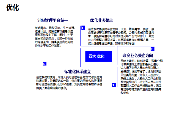 四、速威SRM云平臺的優(yōu)勢:優(yōu)化業(yè)務(wù)整合、改變業(yè)務(wù)關(guān)注方向、標(biāo)準(zhǔn)化體系建設(shè)、統(tǒng)一SRM管理平臺