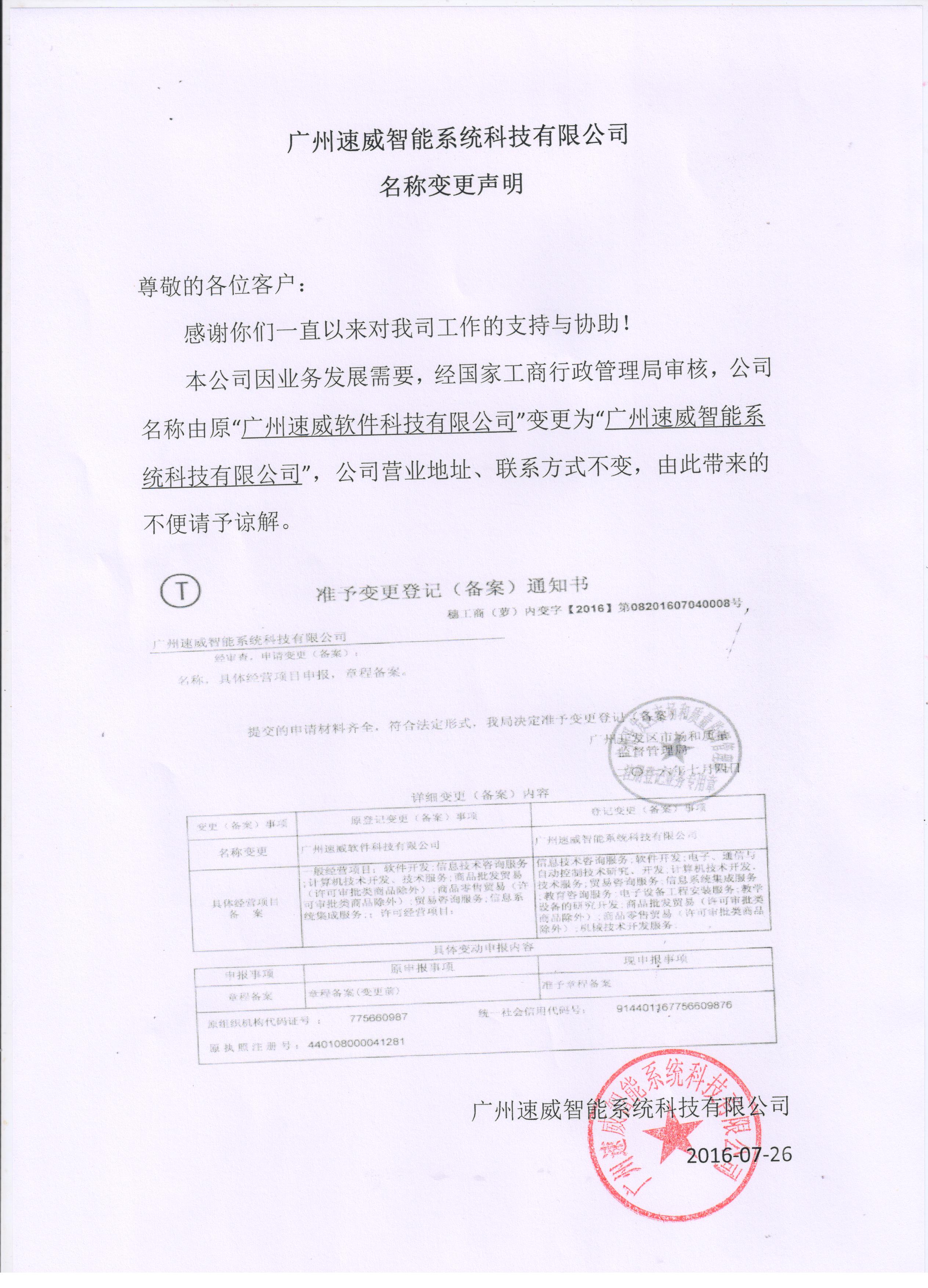 感謝朋友們10+年對本公司的支持。因業(yè)務(wù)需要,公司由《廣州速威軟件科技有限公司》更名為《廣州速威智能系統(tǒng)科技有限公司》。同時(shí)業(yè)務(wù)范圍也拓展為: