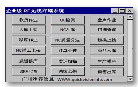 該系統(tǒng)包括:收貨作業(yè)、入庫上架、移庫作業(yè)、NC返工上架、發(fā)運(yùn)移庫、調(diào)撥收貨、QC檢測、NC入庫、NC質(zhì)量分揀、訂單處理、發(fā)運(yùn)掃描、調(diào)撥上架、盤點(diǎn)作業(yè)、掃描查詢、切換上線、成品入庫、生產(chǎn)領(lǐng)料、銷售出庫等功能模塊。